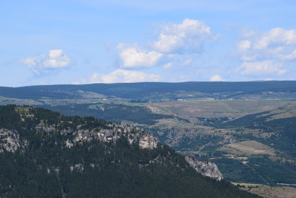 La descente offre un panorama sur le vallon d’Ispagnac et de Quézac. La montée dans les pins débouche sur un paysage de bocages propices à de nombreux oiseaux et utilisés par les troupeaux de mouton du secteur.
